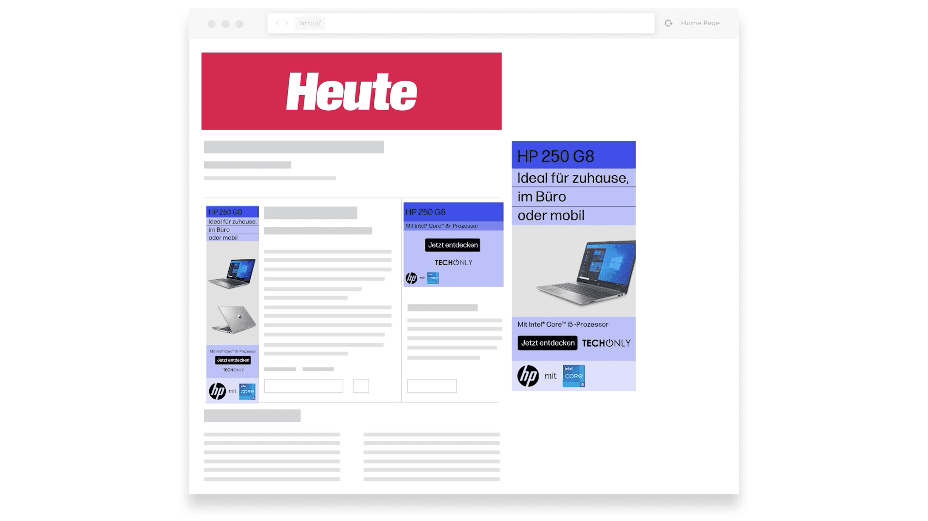 In enger Zusammenarbeit mit HP setzen wir quartalsweise Kampagnen für diverse HP-Produkte um. Dabei übernehmen wir das Kampagnenmanagement und produzieren dafür die passenden Werbemittel on- und offline. Bei dieser Kampagne setzten wir auf Google Ads und unsere erstellten HTML-5 Banner werden auf diversen Plattformen wie standard.at, oe24.at, kurier.at oder heute.at ausgespielt. Zusätzlich zur Google-Kampagne kommen unsere angefertigten Werbemittel auch Out-of-home zum Einsatz und generieren dadurch eine hohe Reichweite.