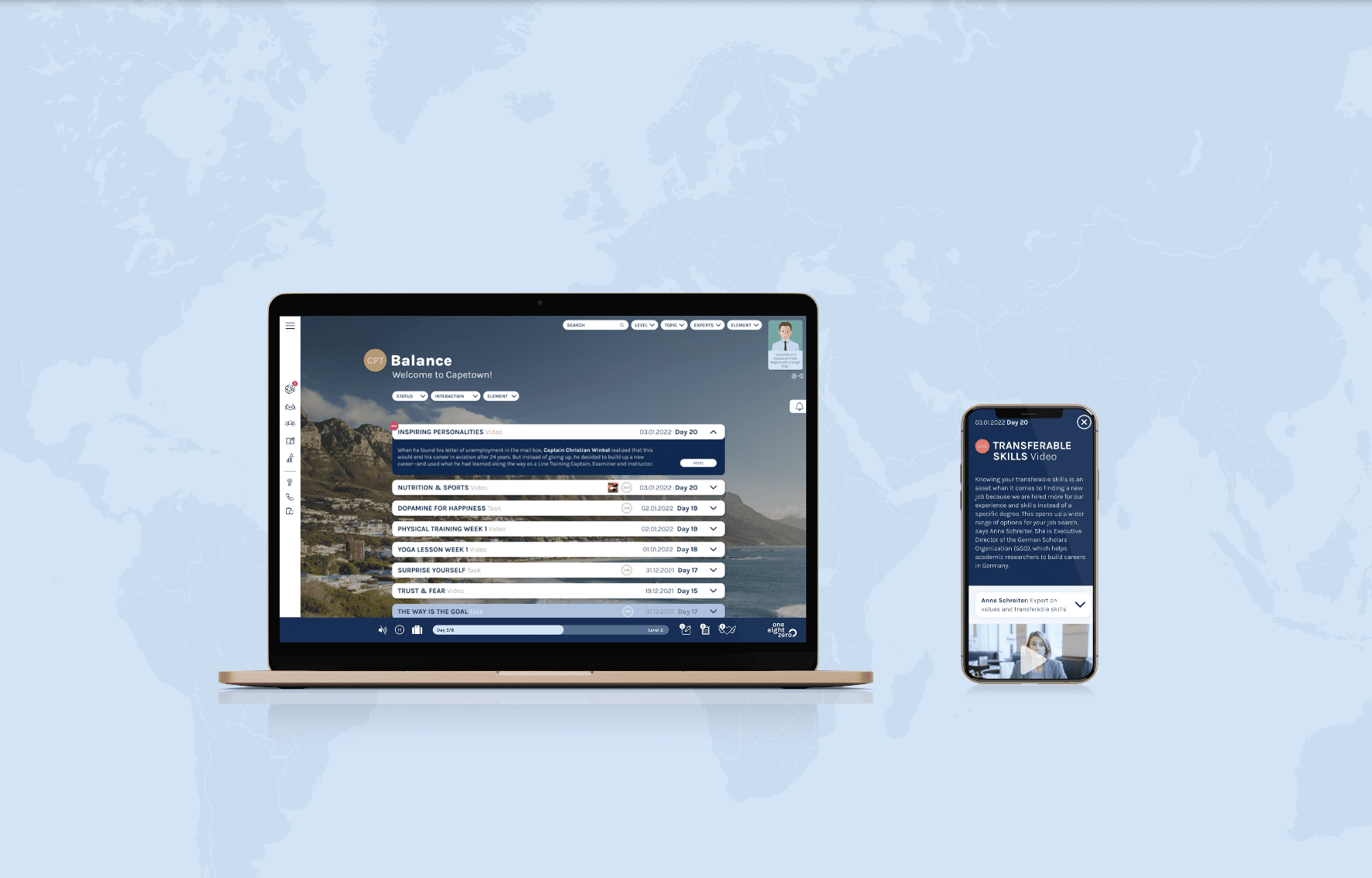 Veränderung birgt eine der größten Chancen, sich weiterzuentwickeln, sich selbst neu zu erfinden. One Eight Zero° unterstützt auf spielerische Weise in Form einer virtuellen Weltreise hoch qualifizierte Menschen aus Flight Crews dabei, genau das zu tun und erleichtert ihnen den Weg auf ihrer Reise zu sich selbst und in unbekannte Gewässer. Egal, ob Flugbegleiter:in, Pilot:in oder Ex-Mitarbeiter:innen von Flughäfen, durch die Coaching- und E-Learning-Plattform kann eine Weltreise der Weiterentwicklung, Selbstfindung und ein Kennenlernen neuer Wege, Fähigkeiten und Werte entdeckt werden.