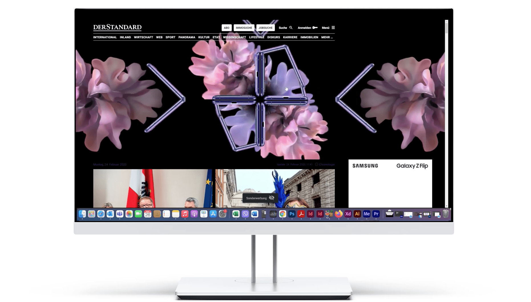Die Samsung Galaxy Z Flip-Kampagne sicherte sich den ersten Platz als beste Onlinekampagne auf den Seiten von derStandard.at im ersten Quartal 2020. Das Unternehmen siegte bei der Wertung der Userinnen und User und begeisterte mit der Mutation-Animation im Stil des Kaleidoskops , für die wir die Produktion übernahmen.